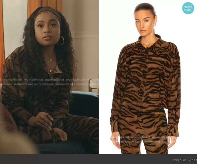 Tiffany (played by Hannaha Hall) on The Chi on ShowTime was spotted wearing this leopard print top and pants on The Chi on episode 'Tower of Terror' (6x15) in Jun 2024. Tiffany's Top is the Cropped Oversized Boyfriend Shirt by Norma Kamali . Tiffany's Pants is the Boot Pant by Norma Kamali.