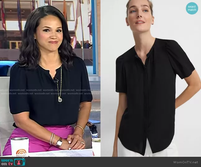 Laura Jarrett on Today on NBC was spotted wearing this black short sleeve blouse and pink pants on Today on Jun 21 2024's episode. Laura's Top is the Short-Sleeve Ruched Blouse in Silk Georgette by Theory . Laura's Pants is the Treeca Pant in Carnation by Theory.