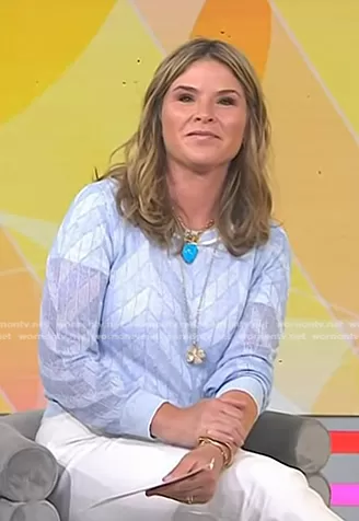 Jenna Bush Hager on Today on NBC was spotted wearing this light blue chevron sweater on Today on Jun 21 2024's episode. Jenna's Sweater is the Magellen Linen-Blend Crewneck Sweater in Light Blue by Veronica Beard.