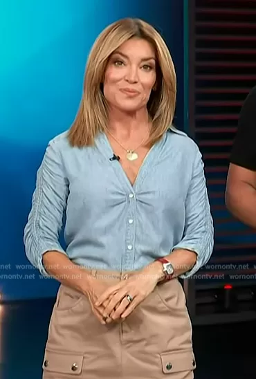 Kit Hoover on Access Hollywood on NBC was spotted wearing this ruched sleeve shirt and cargo mini skirt on Access Hollywood on Jun 24 2024's episode. Kit's Top is the Porta Shirt by Veronica Beard . Kit's Skirt is the San Carlos Mini Skirt by Veronica Beard.