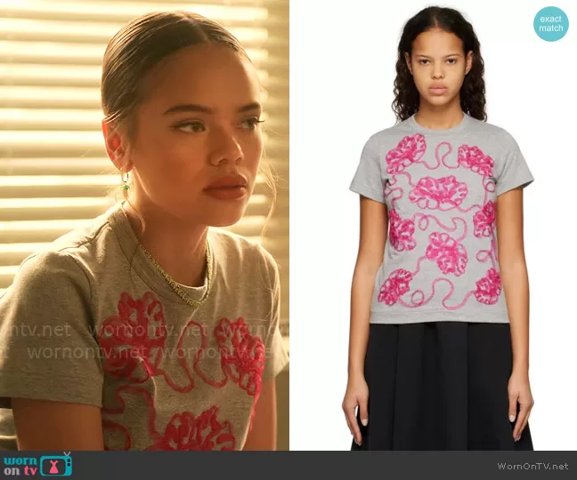 Minnie 'Mouse' Honrada (played by Malia Pyles) on Pretty Little Liars Original Sin on HBO was spotted wearing this floral applique t-shirt on Pretty Little Liars Original Sin on episode 'Chapter Eleven: Loose Ends' (2x01) in May 2024. Mouse's Top is the Floral T-Shirt by Tao.