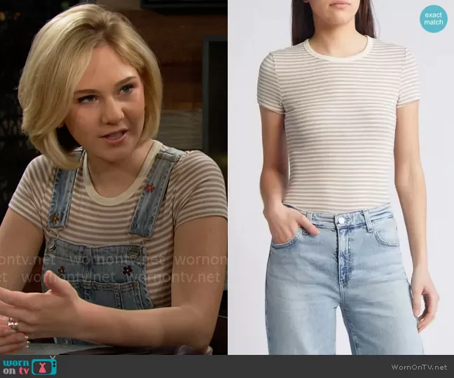 Lucy Romalotti (played by Lily Brooks O’ Briant) on The Young and the Restless on CBS was spotted wearing this floral denim overalls and striped top on The Young and the Restless on Jun 25 2024's episode. Lucy's Top is the Nes Tee in Bengal Stripe by AG . Lucy's Overalls is the Flare Overalls in Petite Fleur by Driftwood .