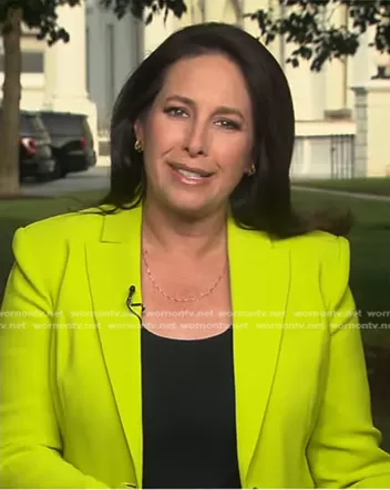 on CBS Evening News on CBS was spotted wearing this Nancy Cordes’ yellow blazer on CBS Evening News on Jun 25 2024's episode. 's Jacket is the Single-Breasted Cady Blazer by Pinko.
