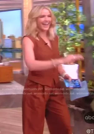Sara Haines on The View on ABC was spotted wearing this brown vest and pants on The View on Jun 26 2024's episode. Sara's Vest is the Classico Wool Waistcoat by Esse Studios . Sara's Pants is the Classico Tailored Wool Trousers by Esse Studios.