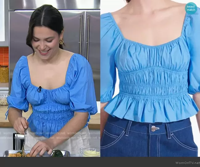 on Today on NBC was spotted wearing this blue smocked top on Today on Jun 26 2024's episode. 's Top is the Staud Faye Top by Staud.