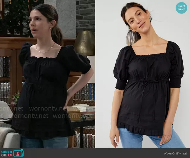 Kristina Corinthos-Davis (played by Kate Mansi) on General Hospital on ABC was spotted wearing this black square neck maternity top on General Hospital on Jun 26 2024's episode. Kristina's Top is the Square Neck Peasant Babydoll Maternity Blouse by A Pea in the Pod .