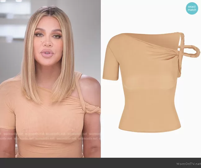 Khloe Kardashian (played by Khloe Kardashian) on The Kardashians on Hulu was spotted wearing this beige twisted shoulder confessional top on The Kardashians on episode 'Stick Up Your Ass' (5x06) in Jun 2024. Khloe's Top is the Mesh Stretch Twisted Top by Khy.