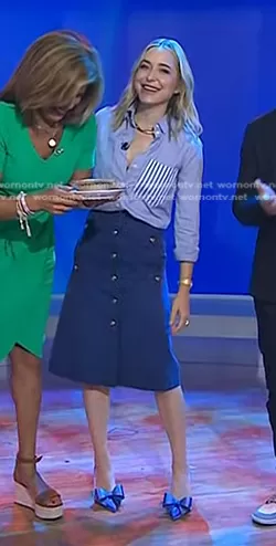 on Today on NBC was spotted wearing this blue striped shirt bow pumps on Today on Jun 27 2024's episode. 's Top is the Vintage Striped Button Down Shirt by Celine . 's Skirt is the Vintage Denim Midi Skirt by Celine . 's Shoes is the Satin Effect High Heel Shoes by Zara.