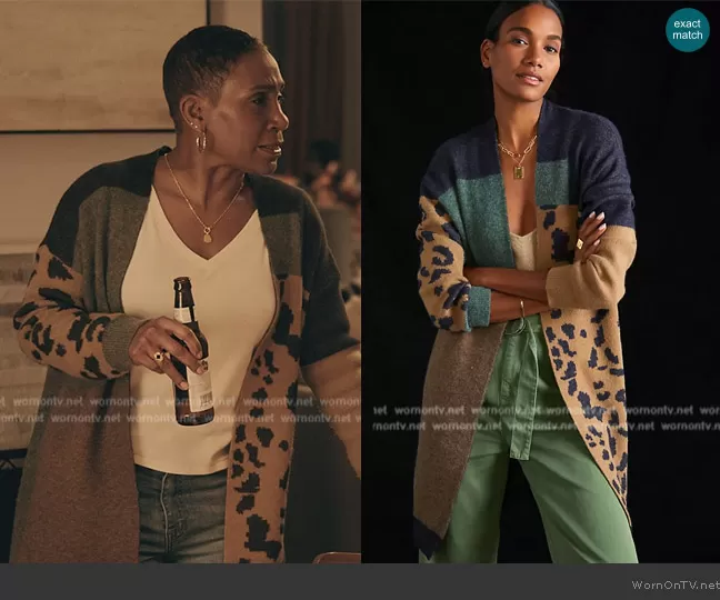 (played by ) on The Chi on ShowTime was spotted wearing this Patchwork long cardigan on The Chi on episode 'Thanksgiving' (6x16) in Jun 2024. 's Sweater is the Animal-Printed Duster Cardigan by Anthropologie.