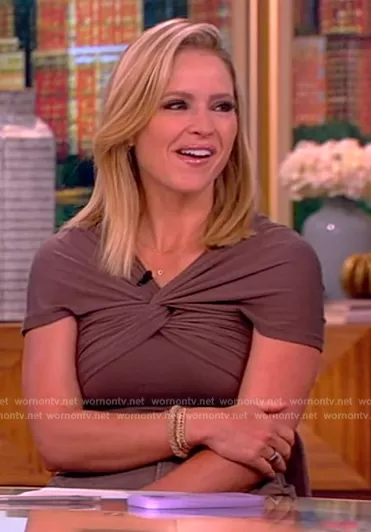 Sara Haines on The View on ABC was spotted wearing this brown twist front top on The View on Jun 28 2024's episode. Sara's Top is the The I'm Evolved Off the Shoulder Top by Favorite Daughter.