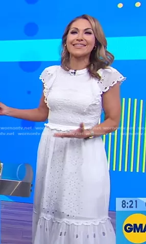 Lori Bergamotto on Good Morning America on ABC was spotted wearing this white smocked eyelet dress on Good Morning America on Jun 28 2024's episode. Lori's Dress is the Addie Eyelet Dress by Sea.