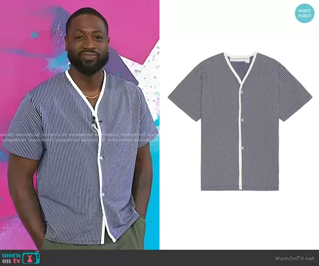 on Today on NBC was spotted wearing this navy striped v-neck shirt on Today on Jul 01 2024's episode. 's Shirt is the 1960's Malibu High Gauze Wave Stripe Pj Top by Advisory Board Crystals.
