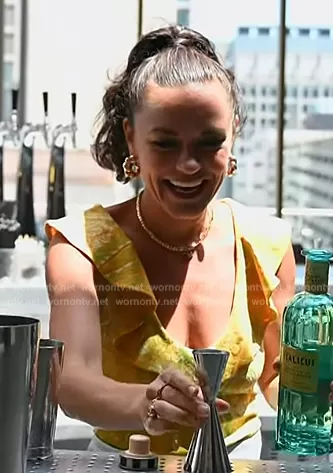 on Access Hollywood on NBC was spotted wearing this yellow ruffle top on Access Hollywood on Jun 29 2024's episode. 's Top is the Cropped Ruffle Top in Paisley Brocade Print by Zara.