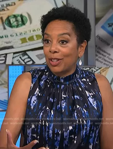 on NBC News Daily on NBC was spotted wearing this blue floral ruched top on NBC News Daily on Jul 01 2024's episode. 's Top is the Silk Sleeveless Top by Lafayette 148 New York.