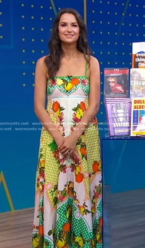 on Good Morning America on ABC was spotted wearing this fruit print dress on Good Morning America on Jul 01 2024's episode. 's Dress is the Lemonis Linen Sundress in Yellow Multi by Alemais.