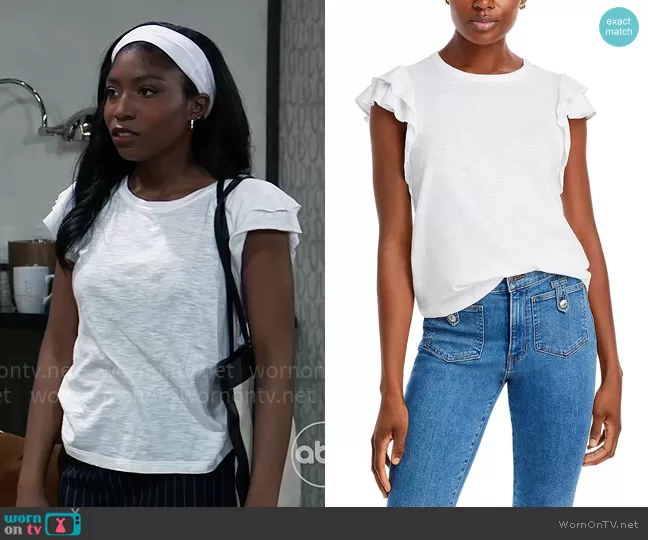 Trina Robinson (played by Tabyana Ali) on General Hospital on ABC was spotted wearing this white ruffle sleeve t-shirt and pinstripe mini skirt on General Hospital on Jul 01 2024's episode. Trina's Top is the Akeela T-shirt by Veronica Beard . Trina's Skirt is the Annette Skirt by Staud . Trina's Bag is the Effortless Tote by Banana Republic.