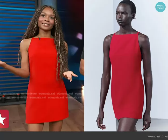 Zuri Hall on Access Hollywood on NBC was spotted wearing this red mini dress on Access Hollywood on Jul 03 2024's episode. Zuri's Dress is the Mini Dress ZW Collection by Zara.
