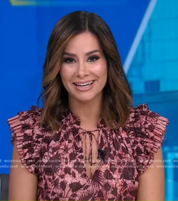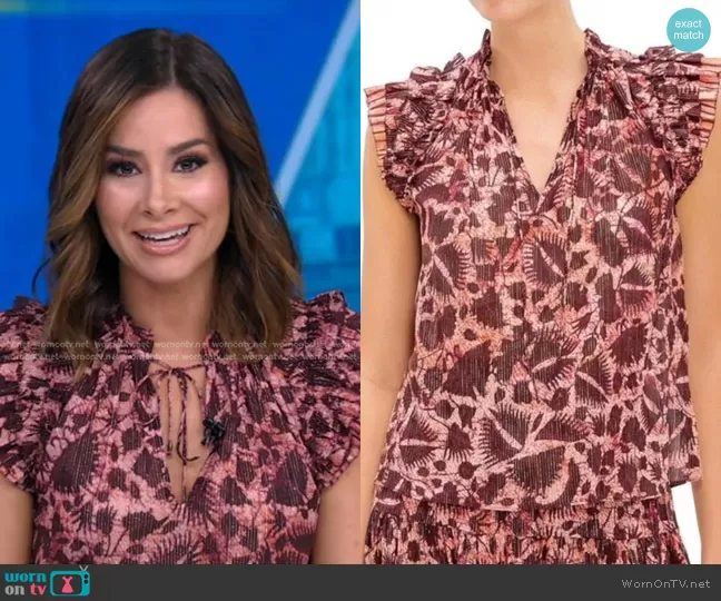 Rebecca Jarvis on Good Morning America on ABC was spotted wearing this pink printed ruffle top on Good Morning America on Jul 04 2024's episode. Rebecca's Top is the Dira Top in Bordeaux by Ulla Johnson.