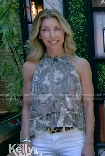 on Live with Kelly and Mark on Disney ABC Home Entertainment was spotted wearing this paisley print top on Live with Kelly and Mark on Jul 05 2024's episode. 's Top is the Renee Paisley Print Silk Halter Top in Barely Orchid Multi .