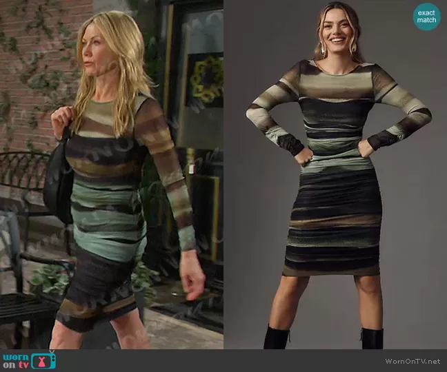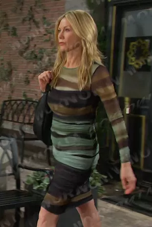 Kristen DiMera (played by Stacy Haiduk) on Days of our Lives on Peacock was spotted wearing this green stripe mesh dress on Days of our Lives on Jul 06 2024's episode. Kristen's Dress is the Ruched Mock-Neck Long-Sleeve Midi Dress by Anthropologie.