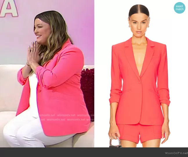 on Today on NBC was spotted wearing this coral blazer on Today on Jul 05 2024's episode. 's Blazer is the Khloe Crepe Ruched Blazer in Neon Coral by Cinq a Sept.