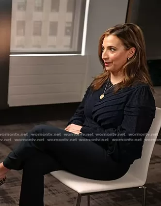 on Today on NBC was spotted wearing this navy dot pleated top and pants on Today on Jul 05 2024's episode. 's Top is the Sabotage Tucked Swiss-dot Georgette Blouse in Navy by Zimmermann . 's Pants is the Robertson Flare Hem Pants in Midnight by Derek Lam 10 Crosby.