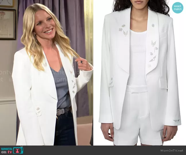 Christine Blair Williams (played by Lauralee Bell) on The Young and the Restless on CBS was spotted wearing this white rhinestone embellished blazer on The Young and the Restless on Jul 08 2024's episode. Christine's Jacket is the Date Diamanté Blazer by Zadig and Voltaire.
