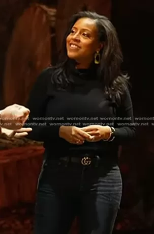 Sheinelle Jones on Today on NBC was spotted wearing this black belt and earrings on Today on Jul 05 2024's episode. Sheinelle's Belt is the Leather Belt with Double G Buckle by Gucci . Sheinelle's Earrings is the Square Gold Tone Drop Earrings by Chicos.