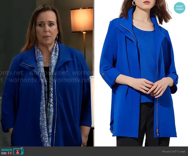 Laura Collins (played by Genie Francis) on General Hospital on ABC was spotted wearing this blue jacket on General Hospital on Aug 09 2024's episode. Laura's Jacket is the Deco Crepe Woven Lapel Collar 3/4 Roll-Tab Sleeve Pocketed Jacket by Ming Wang .