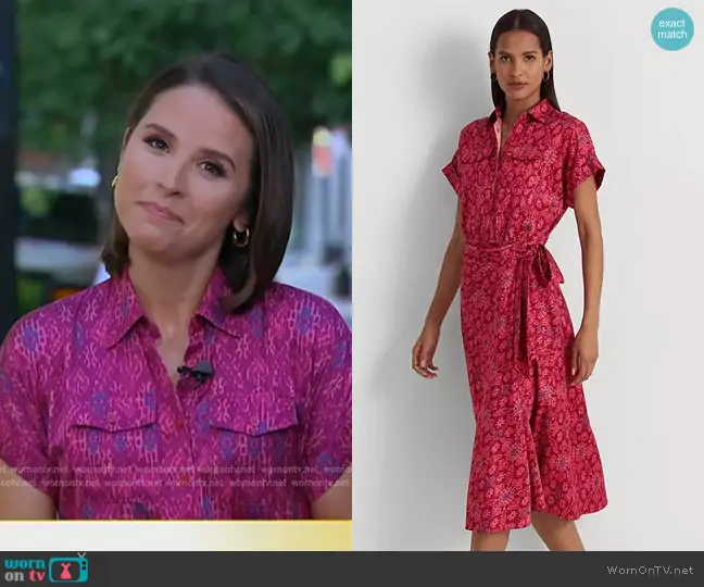 Elizabeth Schulze on Good Morning America on ABC was spotted wearing this pink printed dress on Good Morning America on Jul 08 2024's episode. Elizabeth's Dress is the Geo-Print Shantung Tie-Waist Dress by Lauren Ralph Lauren.