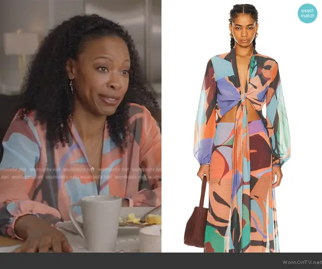 Grace James (played by Karimah Westbrook) on All American on CWTV was spotted wearing this abstract print blouse on All American on episode 'I Do Part I' (6x14) in Jul 2024. Grace's Top is the Honey Blouse by Silvia Tcherassi.