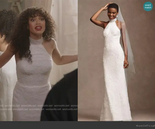 Olivia Baker (played by Samantha Logan) on All American on CWTV was spotted wearing this white textured wedding dress on All American on episode 'I Do Part I' (6x14) in Jul 2024. Olivia's Dress is the Belle Scalloped Halter Wedding Gown by Watters.