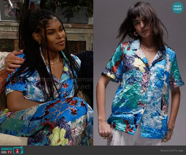 Paris Buckingham (played by Diamond White) on The Bold and the Beautiful on CBS was spotted wearing this blue printed shirt and skirt set on The Bold and the Beautiful on Jul 09 2024's episode. Paris's Top is the Oversize Resort Print Button-Up Shirt by Topshop . Paris's Skirt is the Resort Print Maxi Skirt by Topshop.