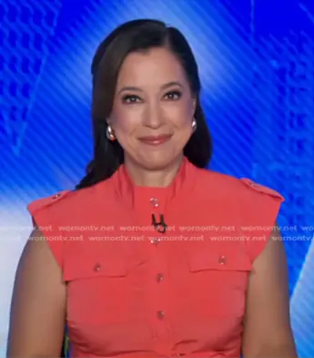 on Good Morning America on ABC was spotted wearing this pink patch pocket dress on Good Morning America on Jul 09 2024's episode. 's Dress is the Belted Handkerchief-Hem Midi Dress in Apple by Karl Lagerfeld.