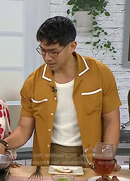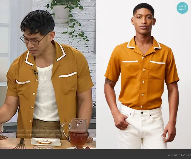 on Today on NBC was spotted wearing this mustard contrast trim shirt on Today on Jul 10 2024's episode. 's Shirt is the Japanese Rayon Bowling Shirt by Todd Snyder.