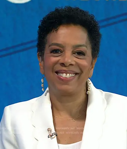 on Today on NBC was spotted wearing this white scalloped trim blazer on Today on Jul 10 2024's episode. 's Blazer is the Scallop Blazer by T Tahari.