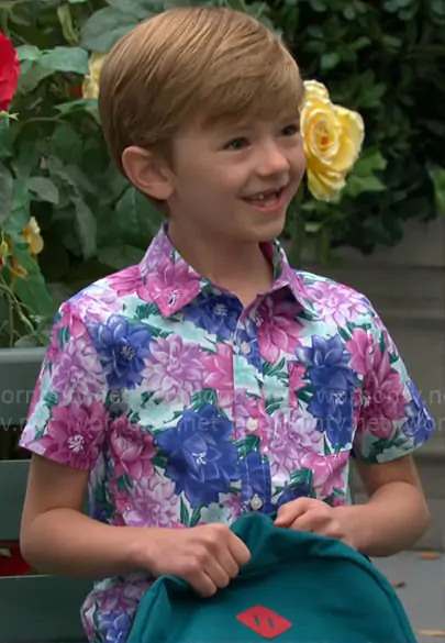 Harrison Abbott (played by Redding Munsell) on The Young and the Restless on CBS was spotted wearing this floral shirt on The Young and the Restless on Jul 11 2024's episode. 's Shirt is the Floral Poplin Shirt in Light Floral Violet by Janie and Jack .