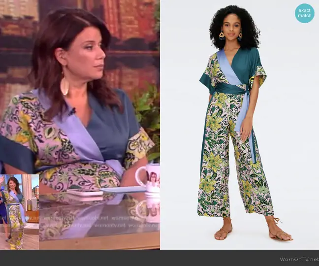 Ana Navarro on The View on ABC was spotted wearing this floral colorblock jumpsuit on The View on Mar 17 2025's episode. Ana's Jumpsuit is the Rinna Jumpsuit in Garden Paisley by Diane von Furstenberg.