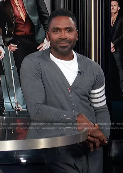 Justin Sylvester on E! News on E! was spotted wearing this gray sleeve stripe cardigan on E! News on Jul 11 2024's episode. Justin's Sweater is the 4-Bar Milano Stitch cardigan by Thom Browne.