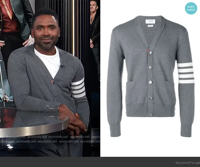 Thom Browne 4-Bar Milano Stitch cardigan worn by Justin Sylvester on E! News