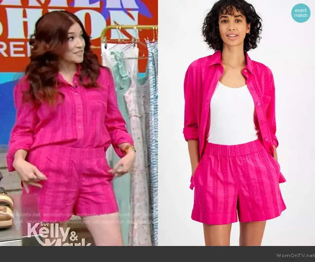 on Live with Kelly and Mark on Disney ABC Home Entertainment was spotted wearing this pink embroidered stripe top and shorts on Live with Kelly and Mark on Jul 12 2024's episode. 's Top is the Embroidered Shirt by On 34th . 's Shorts is the Embroidered Pull-On Shorts On 34th.