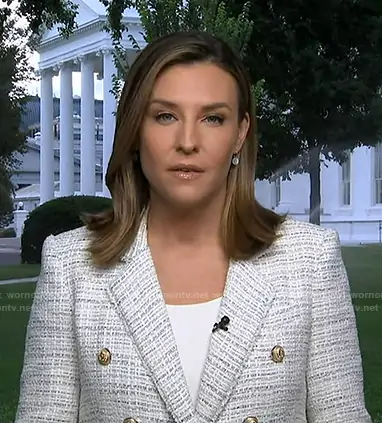 Mary Bruce on Good Morning America on ABC was spotted wearing this white double breasted tweed blazer on Good Morning America on Aug 28 2025's episode. Mary's Jacket is the Eliza Tweed Blazer in Cream Denim by Generation Love.