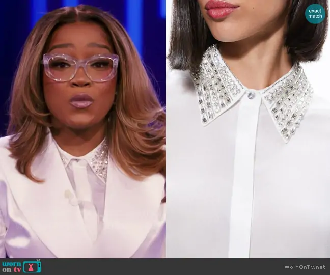 Keke Palmer on Password on NBC was spotted wearing this white satin blazer on Password on Jul 09 2024's episode. Keke's Top is the Willa Embellished Collar Shirt by Alice + Olivia . Keke's Jacket is the Satin Double-Breasted Blazer by LaQuan Smith . Keke's Skirt is the High-Waisted Corset Mini Skirt by LaQuan Smith.