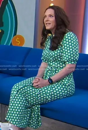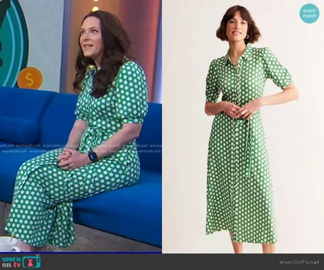on Good Morning America on ABC was spotted wearing this Carrie Joy Grimes’ green geometric print shirtdress on Good Morning America on Jul 15 2024's episode. 's Dress is the Libby Jersey Midi Shirt Dress Green Honeycomb Geo by Boden.
