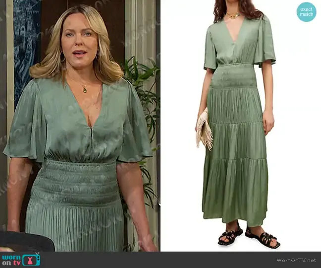Nicole Walker (played by Arianne Zucker) on Days of our Lives on Peacock was spotted wearing this sage green smocked dress on Days of our Lives on Jul 16 2024's episode. Nicole's Dress is the Rome Dress in Green by Maje.