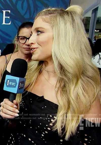 on E! News on E! was spotted wearing this black eyelet mini dress on E! News on Jul 16 2024's episode. 's Dress is the Butterfly Eyelet Off-the-Shoulder Dress by Milly.