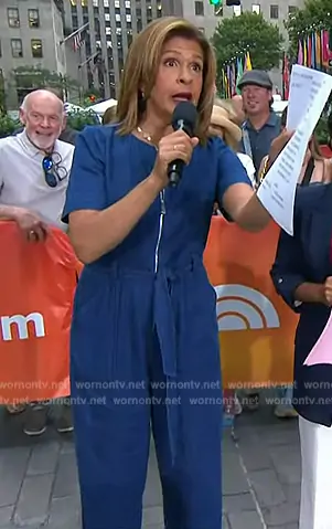 Hoda Kotb on Today on NBC was spotted wearing this denim tie waist jumpsuit on Today on Jul 17 2024's episode. Hoda's Jumpsuit is the Denim Short Sleeve Jumpsuit by Whistles.