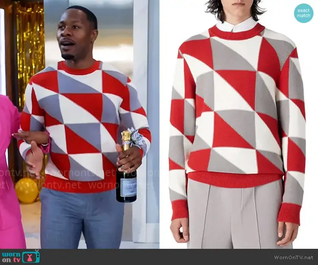Gary (played by Chido Nwokocha) on Tyler Perrys Sistas on BET was spotted wearing this red geometric print sweater on Tyler Perrys Sistas on episode 'It Takes A Village' (7x19) in Jul 2024. 's Sweater is the Geometric Crewneck Sweater by Emporio Armani.