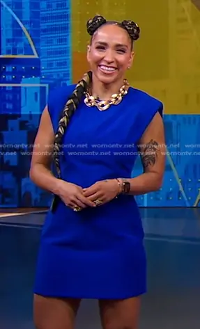 on Good Morning America on ABC was spotted wearing this blue strong shoulder mini dress on Good Morning America on Jul 17 2024's episode. 's Dress is the Mini Dress with Shoulder Pads in Cobalt by Zara . 's Necklace is the Gold Link Necklace by Zara.