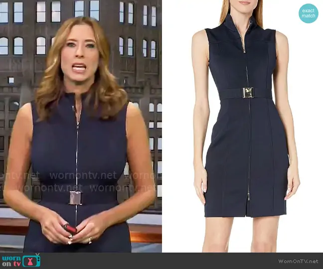 Stephanie Abrams on CBS Mornings on CBS was spotted wearing this Stephanie Abrams’ navy zip front dress on CBS Mornings on Jul 18 2024's episode. Stephanie's Dress is the Classic Scuba Zip Up Dress by Tommy Hilfiger .